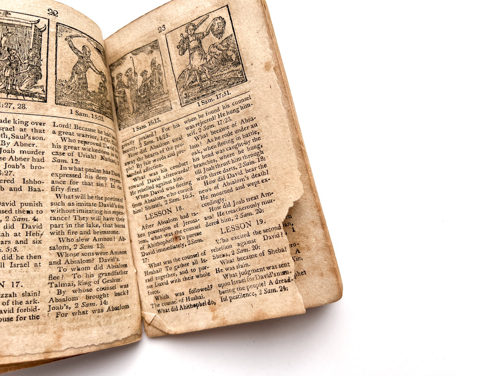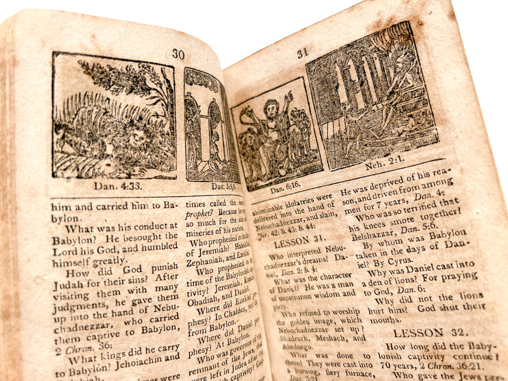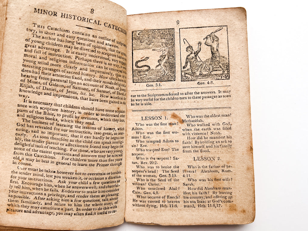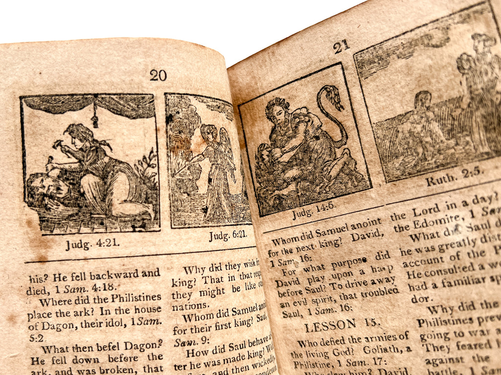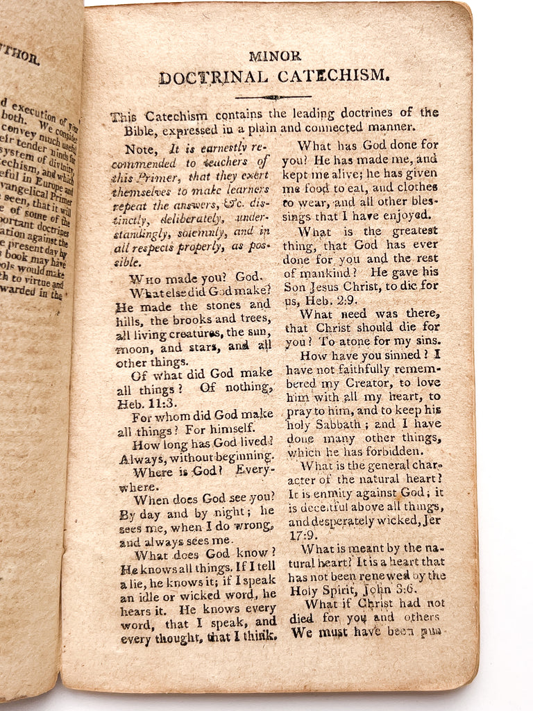 Ninth edition, with 72 cuts. Original marbled wraps, 32mo, 72pp. Inverted page number "6". Good to Very Good. Tear to the lower corner of 23-24 not affecting legibility. Rubbing wear and rounded corners. A nice example of a popular American moral primer including the Westminster shorter catechism and plentiful woodcuts. American Imprints 43940.
