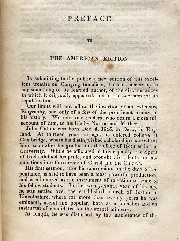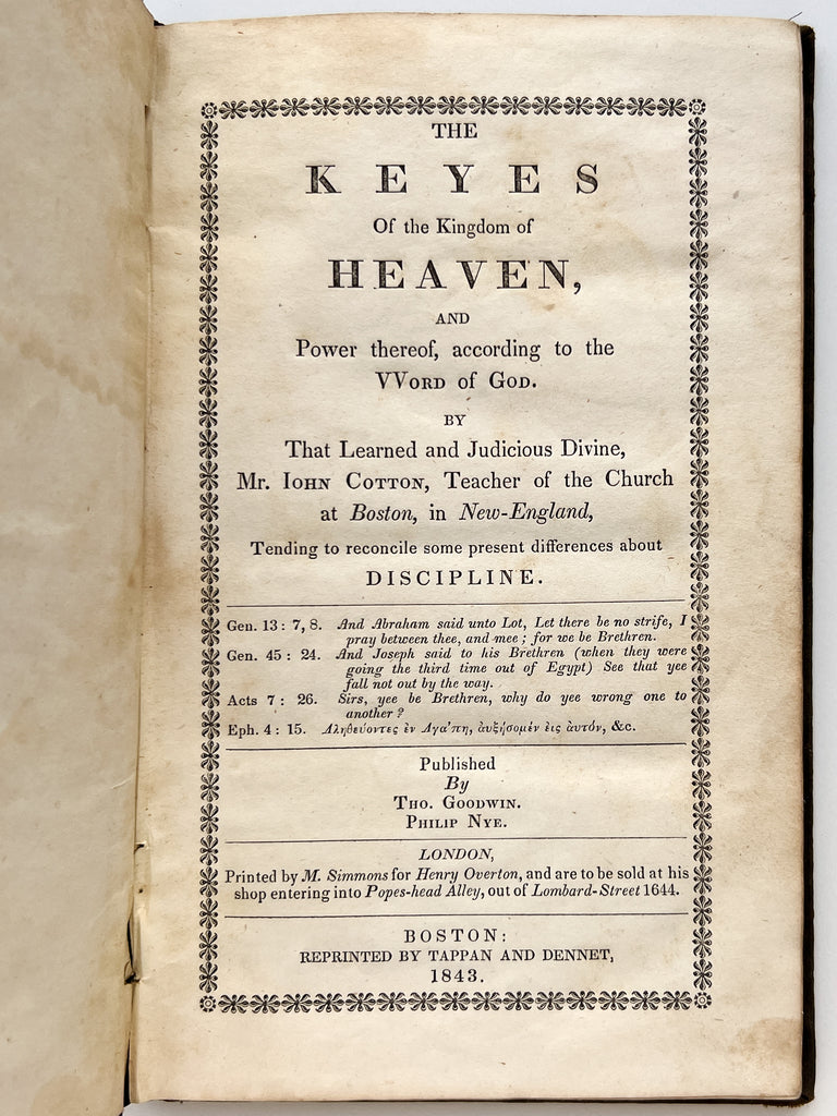 Published by Tho. Goodwin [and] Philip Nye. London, Printed by M. Simmons for H. Overton; reprinted by Tappan and Dennet, Boston with new preface to the American Edition. Brown blind embossed cloth 8vo, 108pp. Good with rubbing to cloth, mottling to boards and residual dampstaining and mottling/soil to the endpapers, mild foxing to text. A foundational text of Congregationalism addressing the distribution of spiritual authority, establishing that church discipline rests with the entire congregation, and discussing the rights and responsibilities of both elders and the "body of brethren." Sabin 17068.