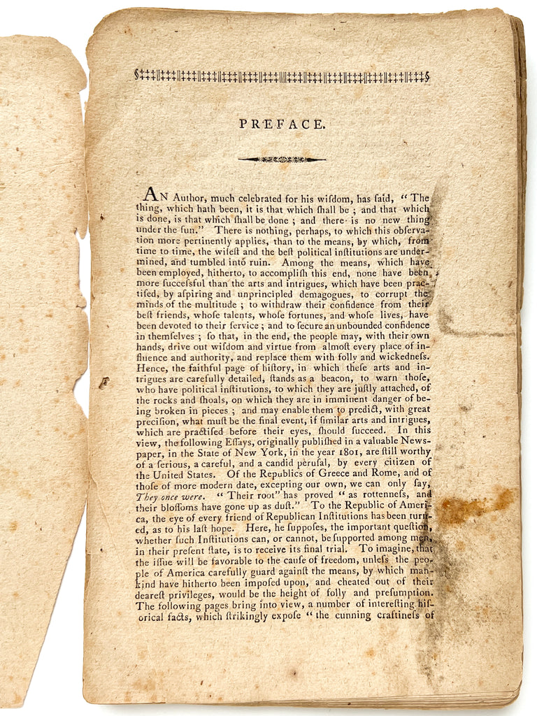 "An author, much celebrated for his wisdom, has said, 'The thing, which hath been, it is that which shall be; and that which is done, is that which shall be done; and there is no new thing under the sun.' There is nothing, perhaps, to which this observation more pertinently applies, than to the means, by which, from time to time, the wisest and the best political institutions are undermined, and tumbled into ruin. Among the means, which have been employed, hitherto, to accomplish this end, none have been more successful than the arts and intrigues, which have been practiced, by aspiring and unprincipled demagogues, to corrupt the minds of the multitude; to withdraw their confidence from their best friends, whose talents, whole fortunes, and whose lives, have been devoted to their service; and to secure an unbounded confidence in themselves; so that, in the end, the people may, with their own hands, drive out wisdom and virtue from almost every place of influence and authority, and replace them with folly and wickedness." (Preface)