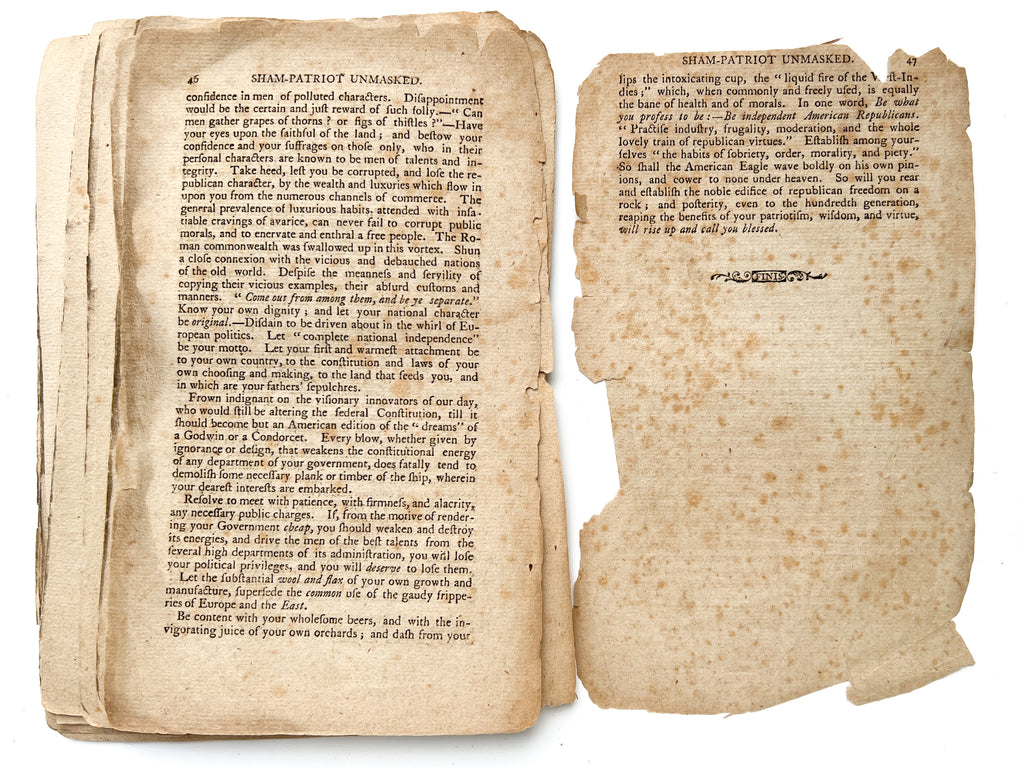 Disbound 8vo, 47pp. Exceedingly temperamental, entirely loose with outer leaves chipping along the edges and threatening to defect if breathed on too heavily. Loss along the upper edge of the last leaf affecting one word in the first line of text, which is otherwise complete and intact. American Imprints 9306.